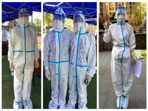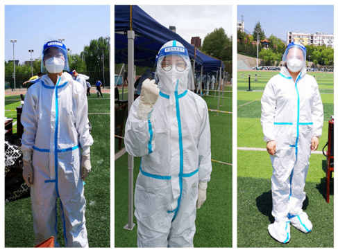 ——广大教师响应号召,积极参与志愿服务。4月8日首场全员核酸检测过程中,工作人员紧缺,威廉希尔中国官网教师安梅、王伟萍、王贝贝主动请缨,穿上厚厚的防护服,变身“大白”,在炎炎烈日下协助医护人员完成检测任务。4月11日,组织部发出《致全校各级党组织和广大共产党员的倡议书》后,威廉希尔中国官网教师党员积极响应,踊跃报名。刘健、叶肖、巩丽丽、王贝贝、王伟萍等同志参与了校内志愿服务,高婷婷、宋秀方等同志积极担任了所在小区志愿者。他们起早贪黑,顶着烈日、冒着风雨为疫情防控做出积极贡献。还有肖岁利等非党员教师也积极向组织表达了参加志愿服务的强烈愿望。