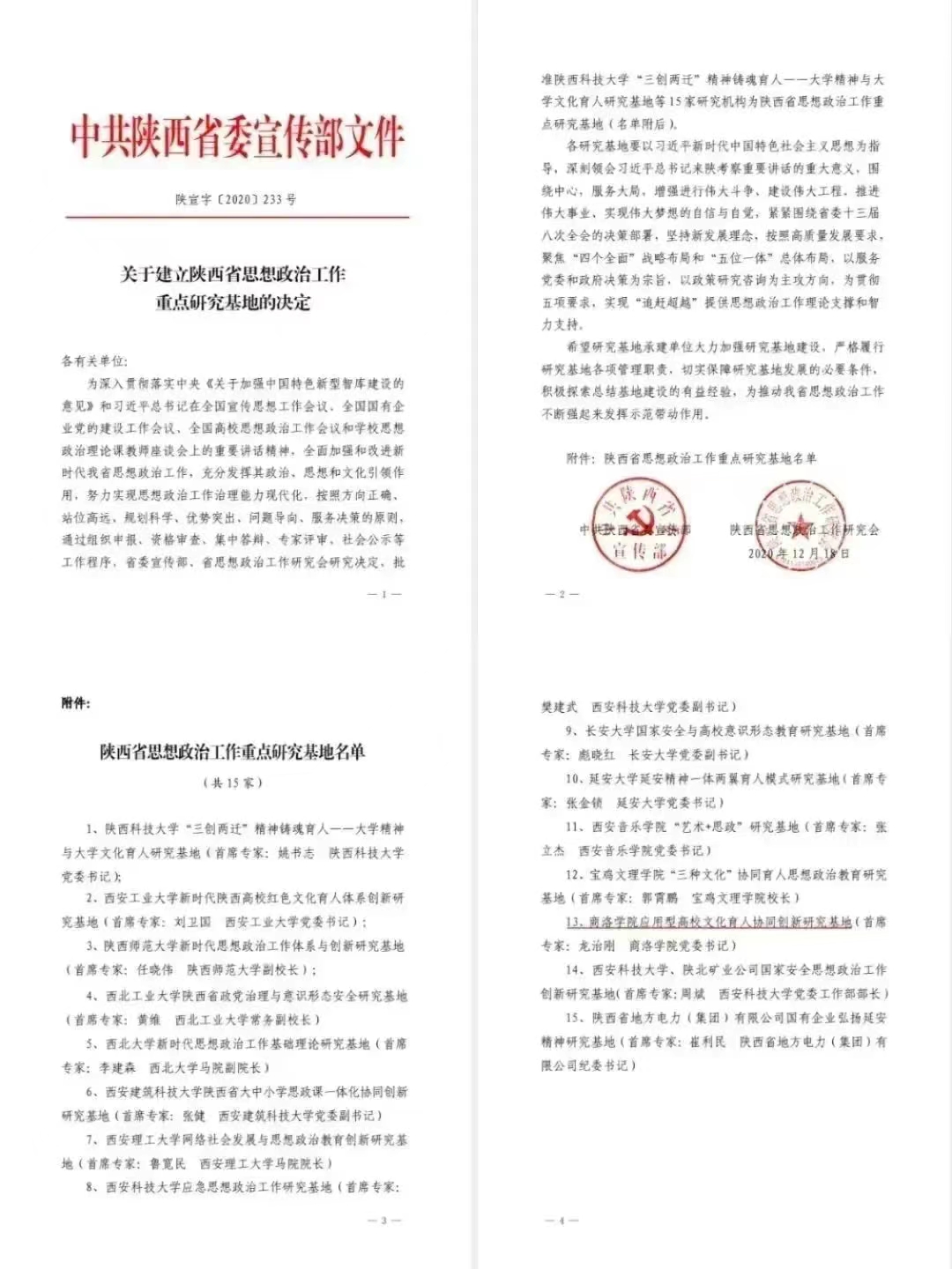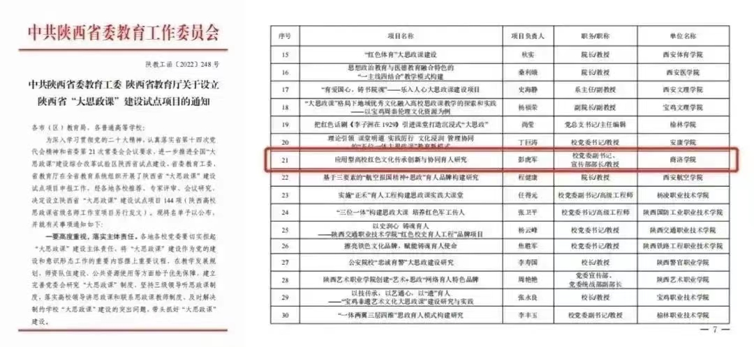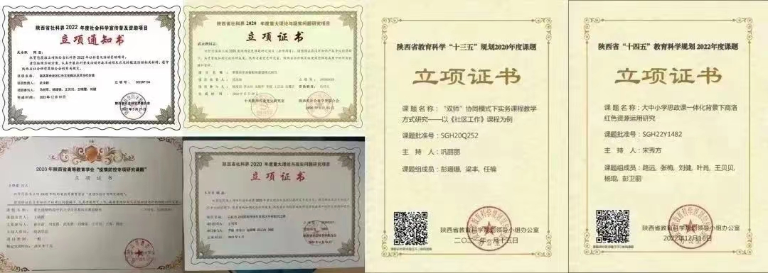 公司现拥有2个省级平台:陕西省思想政治工作重点研究基地——williamhill官网应用型高校文化育人协同创新研究基地、陕西省社科普及基地——社会化问题研究应用科普基地,2个市级平台:商洛革命老区暨红色文化研究中心、秦岭文化研究中心,2个校级平台:williamhill官网思想文化研究所、思想政治教育VR虚拟实验室。承担国家社科基金项目2项,陕西省社科联、陕西省教育厅、科技厅等科研项目70余项,出版各类学术专著、教材40余部,发表各类论文200余篇,其中核心及以上50余篇。