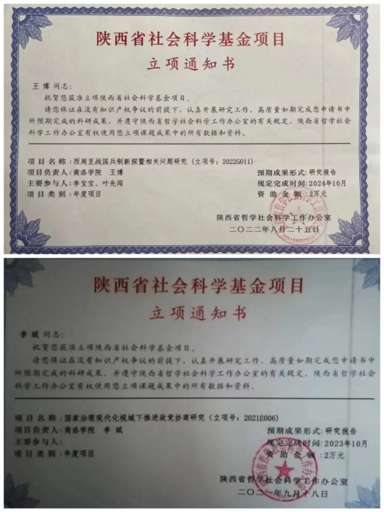 公司承担部分科研立项证书