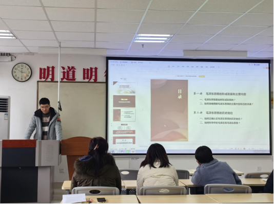 在《毛泽东思想和中国特色社会主义理论体系概论》教研组的集体备课中,寇嘉钰老师分享了“马克思主义中国化时代化的历史进程与理论成果”讲课收获和体会,框架清晰、逻辑严谨、展示规范,树立了年轻教师的典范。叶肖老师抓住“马克思主义中国化的第一次历史性飞跃的重大理论成果及其历史地位”这一教学主题,围绕着“是什么、为什么和怎么办”的理论逻辑,领学了“毛泽东思想及其历史地位”的授课思路。他以涵养深沉的家国情怀从时间和空间的转换入手,巧妙运用“问题简单化”的模式进行了精彩讲授。