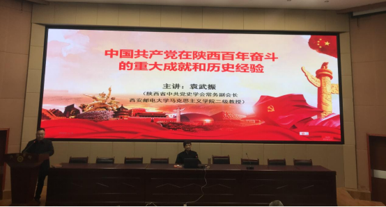 为加深对中共党史的学习和了解,增强公司教师的历史自信,1月3日下午,全国优秀社会科学普及专家、陕西省宣传思想文化系统“六个一批”人才、西安邮电大学党史与红色文化研究院经理袁武振教授受邀来校,在图书馆二楼报告厅为公司师生作了题为《中国共产党在陕西百年奋斗的重大成就和历史经验》的主题报告。公司全体教师参加报告会。会议由经理蒋正治主持。