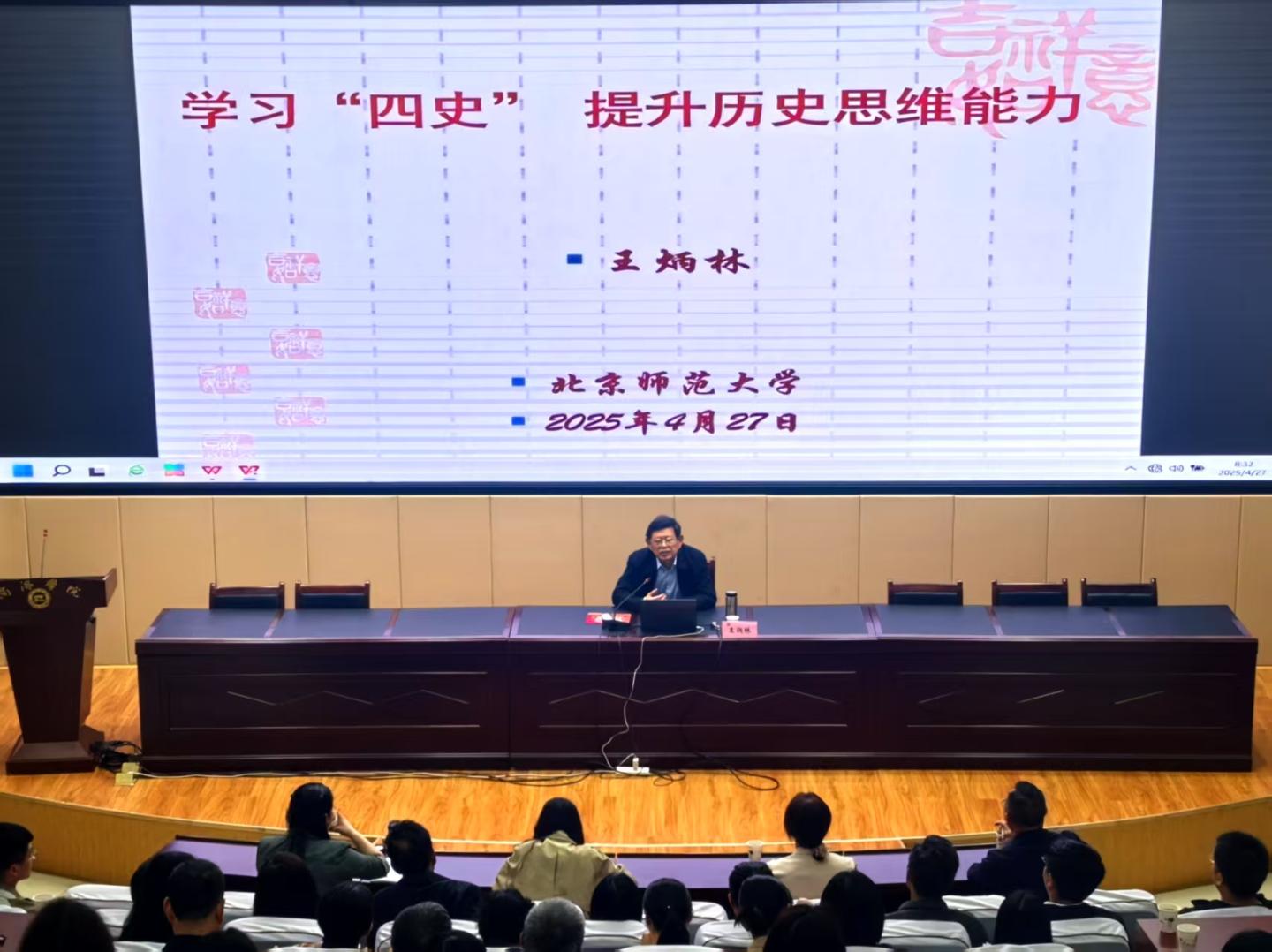 为深入贯彻落实“四史”学习教育相关安排,加强对党的创新理论的研究和阐释,持续提升师生历史思维能力,4月27日上午,中华人民共和国国史学会副会长、教育部高校思政课教指委咨询委员、北京师范大学中共党史党建研究院经理王炳林教授受邀来校,在图书馆二楼报告厅为现场师生作了主题为《学习“四史”,提升历史思维能力》的精彩报告。全国高校思政课教师名师工作室(陕西师范大学)负责人、陕西师范大学威廉希尔中国官网副经理张琳教授代表会议联合举办方莅临现场。公司全体教师、商洛职业技术公司威廉希尔中国官网思政课教师代表,以及公司思政2023级、2024级员工参加本次报告会。会议由公司经理蒋正治主持。