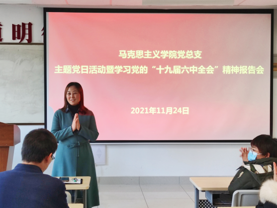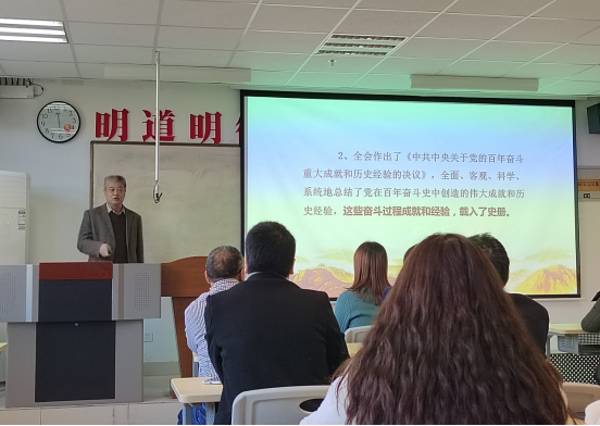 为深入学习贯彻党的十九届六中全会精神,11月24日下午,公司在8号教学楼518教室举办主题党日活动暨学习党的十九届六中全会精神报告会。公司教授、商洛革命老区暨红色文化研究中心主任杨增强为公司全体教师和员工党员作了专题报告,报告会由公司党总支副书记刘麦霞主持。