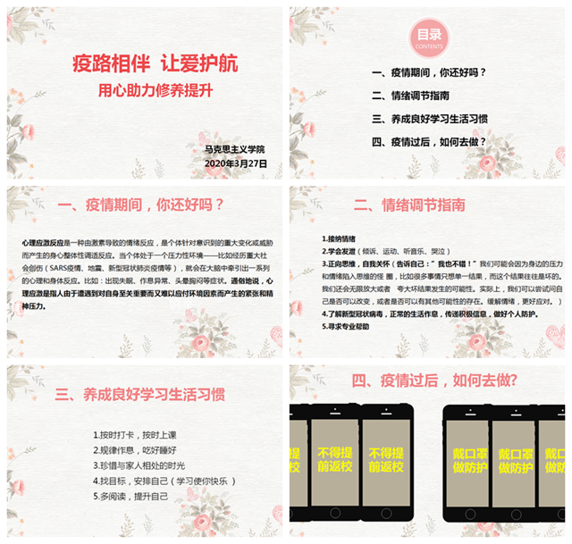 疫情无情人有情,用爱相伴才会赢。病毒的可怕抵不过师生羁绊的心,疫情的来势挡不住互帮互助的情。马院学子心相系、手相连、志相同,在做好隔离防护工作的同时养成规律作息,保持乐观积极的心态,我们相信一定会打赢这场抗疫阻击战。