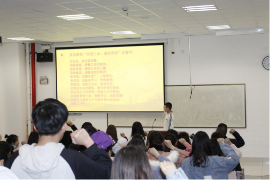首先,集体观看了《我有一只黑狗》宣传片,了解了心理压力和抑郁对自身的威胁,以及正确处理情绪的必要性和心理健康的重要性。随后,赵宏博带领大家举行“珍爱生命,激扬青春”的宣誓。