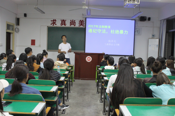 为进一步增强员工的法律意识,教育引导员工逐步树立正确的法制观念,规范自己的言行,9月22日晚,威廉希尔中国官网副经理张冷夫在一号教学楼301教室为2017级新生做了以“遵纪守法,杜绝暴力”为主题的法制教育讲座。