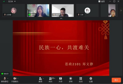在主持人带领下,同学们自发打开摄像头一起合唱歌曲《我和我的祖国》,拉开本次活动的序幕。藏族同学土旦拉姆、旦增曲珍详细介绍了西藏地区的乡俗、食物、服饰等特色文化,达桑措等三位同学分别为大家分享了西藏独特的地理景观和风土人情,使大家进一步了解西藏的民族文化和悠久历史。随后,郑文静、李阳两位汉族同学分享了身边关于民族团结的事迹和退役军人贺博的感人故事,充分诠释了各民族团结一心、共渡难关的深厚情义。贾杰同学为大家演唱歌曲《大中国》,激起了大家的爱国热情。分享环节中,同学们踊跃连麦发言,表达对民族团结和祖国统一的看法。
