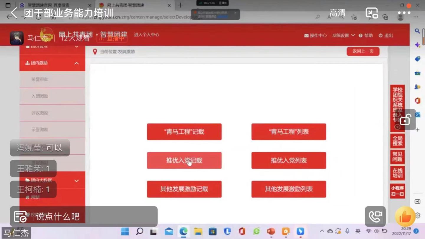 会议上,马仁杰为公司2022级、2021级、2020级团支部书记及团总支主要负责人展示了智慧团建系统的相关操作及指引,并从组织建设和思想建设两个角度对团干部进行业务能力培训,详细介绍了青年大学习系统的团员转入、团员档案的整理与收集等业务的注意事项,并向各团支部书记强调要按时进行青年大学习、及时汇总数据。为增强团支部的凝聚力和战斗力,马仁杰激励各位团支部书记及干部要肩负起作为团干部的责任与重担,领导支部团员积极向上,勇于担当,共同为公司高质量发展贡献青春智慧和力量。