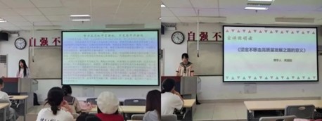 活动中,主持人带领大家一同观看“坚定不移走高质量发展之路”解读视频,使同学们深入了解我国坚定不移走高质量发展之路的重要意义。