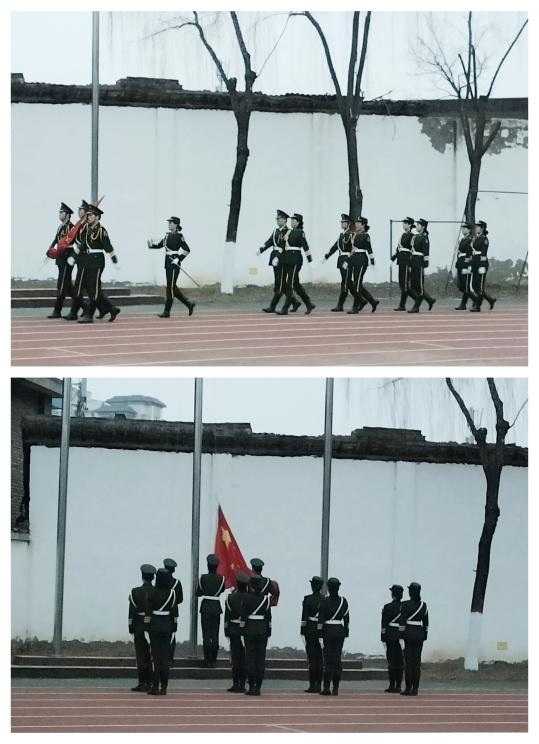 7点10分,国旗护卫队迈着铿锵有力的步伐,护卫着五星红旗走向升旗台,伴随着雄壮的国歌声,鲜艳的五星红旗冉冉升起,全体师生庄严肃穆,面向国旗行注目礼。