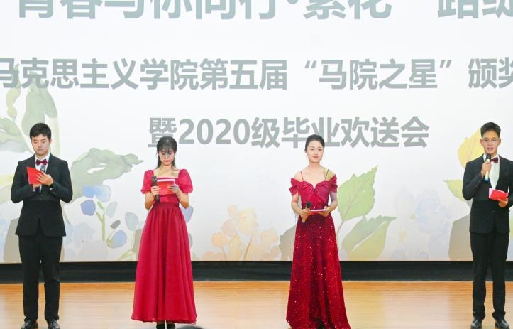 6月25日下午,威廉希尔中国官网于8号教学楼5G影院举办了“青春与你同行繁花一路绽放”第五届“马院之星”颁奖典礼暨2020级毕业生欢送会。本次活动由储怡玥、王嘉馨、李逸尘、宋培延四位同学主持,公司全体师生参加。