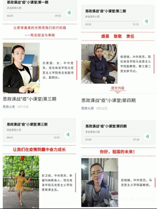 在“思政课战疫小课堂”上,教师们通过对习近平总书记关于疫情防控工作重要讲话精神的解读,对典型人物感人事迹的讲述,对全国人民齐心协力、众志成城抗击疫情精神的颂扬,从爱国、责任、担当、感恩、生态文明等不同角度进行了深入浅出的思政课讲授,帮助同学们读懂中国,深刻了解中国制度、中国精神、中国力量、中国速度,感受中国共产党的伟大,引导青年学子进一步树牢“四个意识”,坚定“四个自信”,坚决做到“两个维护”,以实际行动为战“疫”胜利作出贡献。